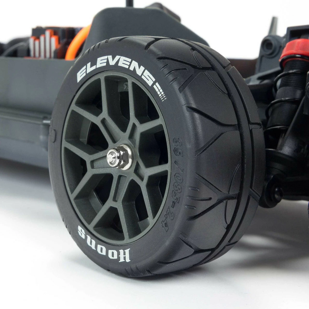 While you’re maximizing the speed potential of the installed Spektrum™ Firma™ brushless motor, the tunable high downforce wing helps keep the dBoots® Hoons™ Elevens vented all-road tires glued to the surface. The tires are mounted on tough, gunmetal colored nylon wheels and deliver incredible traction for quick acceleration or to stop on a dime. A large rear diffuser reduces turbulence and drag.