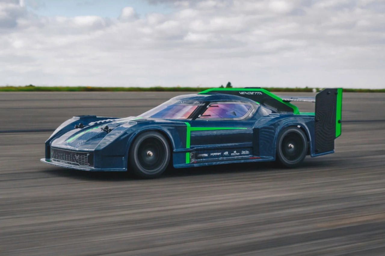 The aerodynamically tuned VENDETTAâ„¢ Speed Racer body includes tough high and low downforce wings. It’s available factory-finished in your choice of stunning green or blue matte and gloss effect paint schemes with scale decals. The body features fender vents to relieve built up air pressure from inside the body to reduce aerodynamic lift and reduce drag. Aerodynamics at work. At the high speeds the VENDETTAâ„¢ Speed Racer can achieve, the aerodynamic elements play a significant part in the performance of the vehicle. The huge rear diffuser, rear wing and wing endplates ensure the VENDETTAâ„¢ Speed Racer is stable at all speeds.