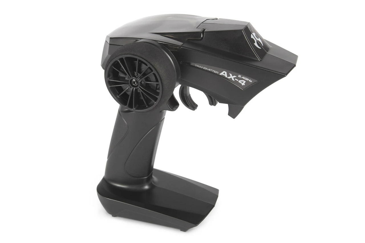 The AX-4 transmitter features a throttle trim knob for low, medium, and high speed setting, a switch for steering servo reversing, steering dual rate, a switch for third channel applications (aux port on the ESC/Receiver), steering trim, battery level indicator, a bind button, and on/off switch.