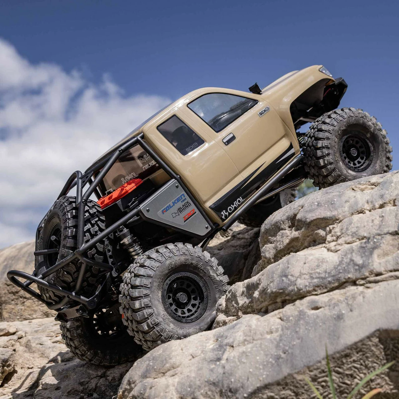 The 7″ tall, officially licensed Falken Wildpeak M/T tires are molded from a high traction compound and feature an aggressive tread pattern. They provide excellent grip and ground clearance over dirt, rocks, and other off-road surfaces for nonstop climbing and crawling.