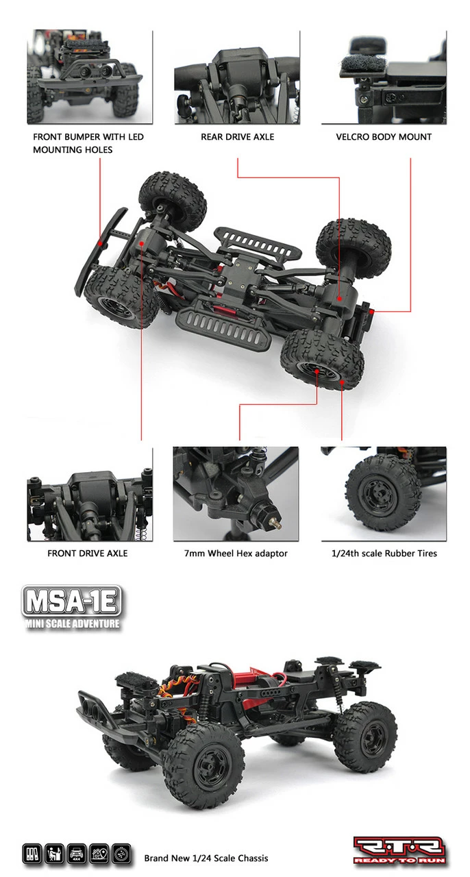 The 1/24 scale MSA-1E Coyote Pup RTR vehicle from Carisma Scale Adventures offers a full-size crawling experience in a tiny package. Completely RTR and even includes 4 AA alkaline batteries for the transmitter.