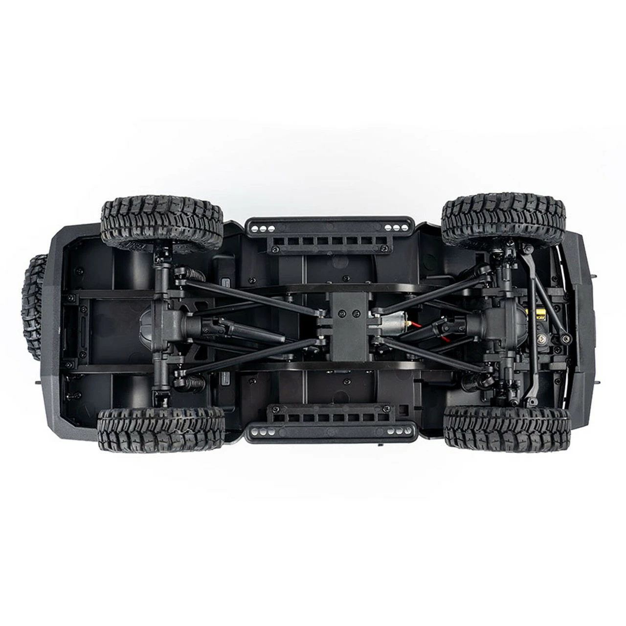 Power is delivered from the super high-torque gearbox to ultra grippy beadlock tires via nylon driveshafts. Water-resistant 2S 7.4V electronics consists of an independent servo, 2-in-1 receiver/ESC, 050 motor and 7.4V 380mAh battery. This allows for a high power-to-weight ratio and all weather operation.