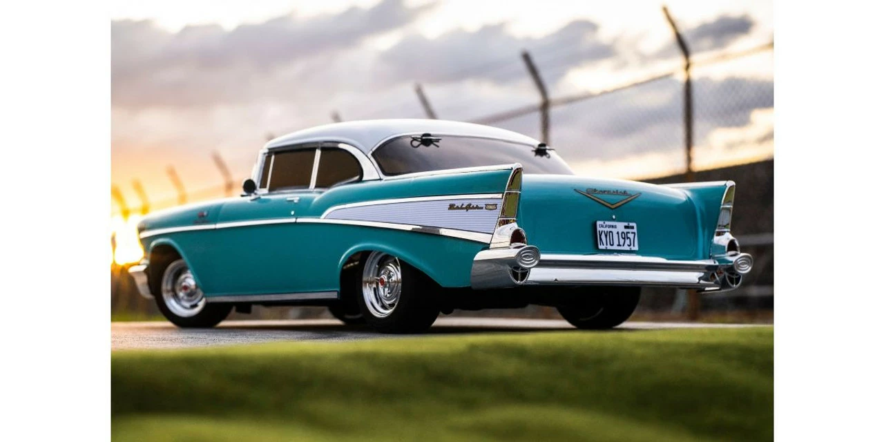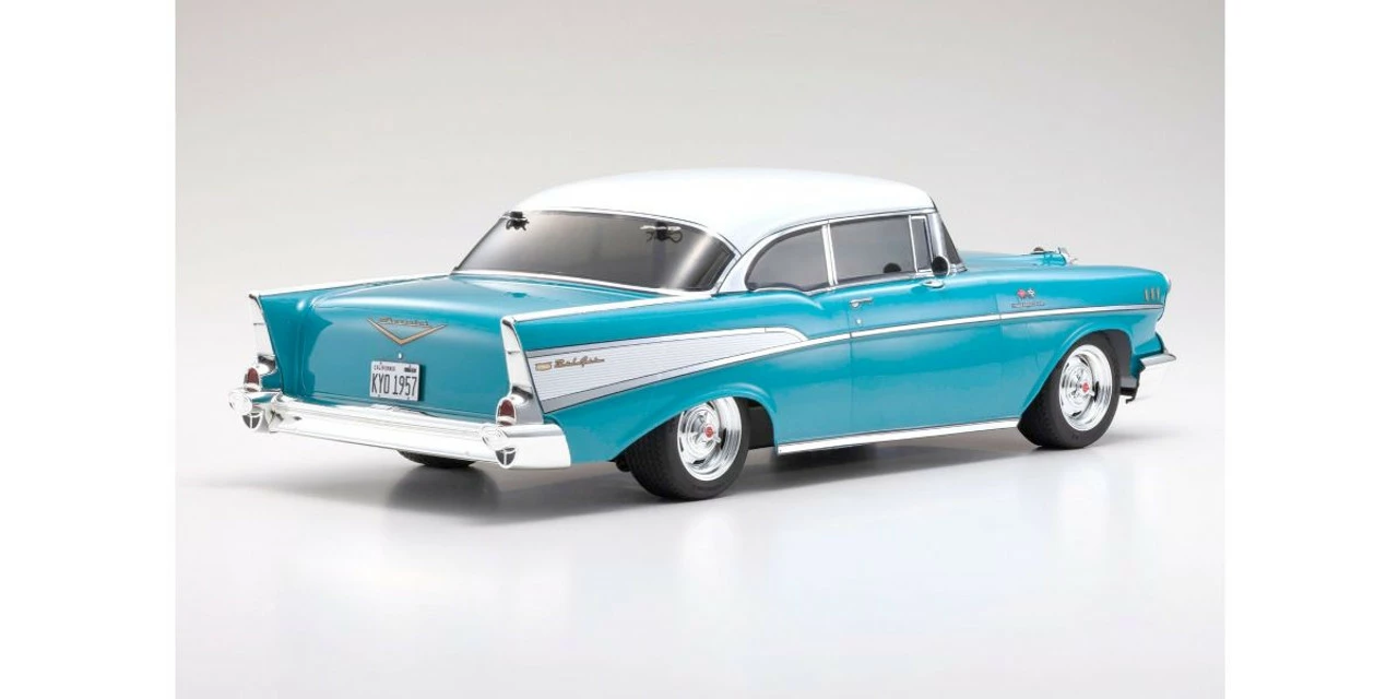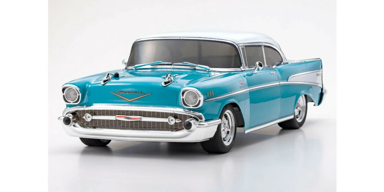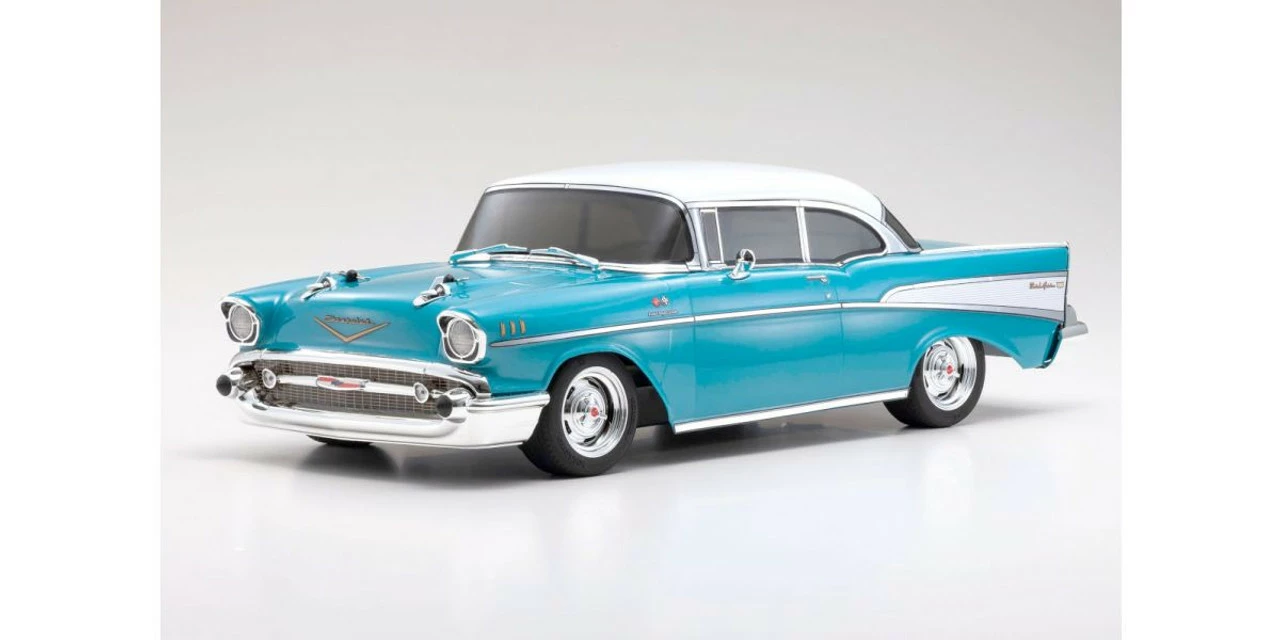 This is the Kyosho EP Fazer Mk2 FZ02L 1957 Chevy Bel Air Coupe ReadySet. Using the iconic 1957 Chevy Bel Air Coupe as an inspiration, Kyosho has expertly recreated this classic car with incredible detail. The scale polycarbonate body incorporates the unmistakable Bel Air grille, lights, window trim and who could forget the large tail fins! The combination of this beautifully reproduced body with the FAZER series chassis can’t be beaten. Kyosho has taken its standard touring car chassis and given it a full model makeover that has evolved performance. A simplified design with fewer parts simplifies maintenance and reduces weight, while core strength and rigidity has been increased through updated materials and ribbing/stiffeners on front and rear. In addition, the symmetrical chassis design offers excellent front-rear suspension balance with responsive control, regardless of power source.