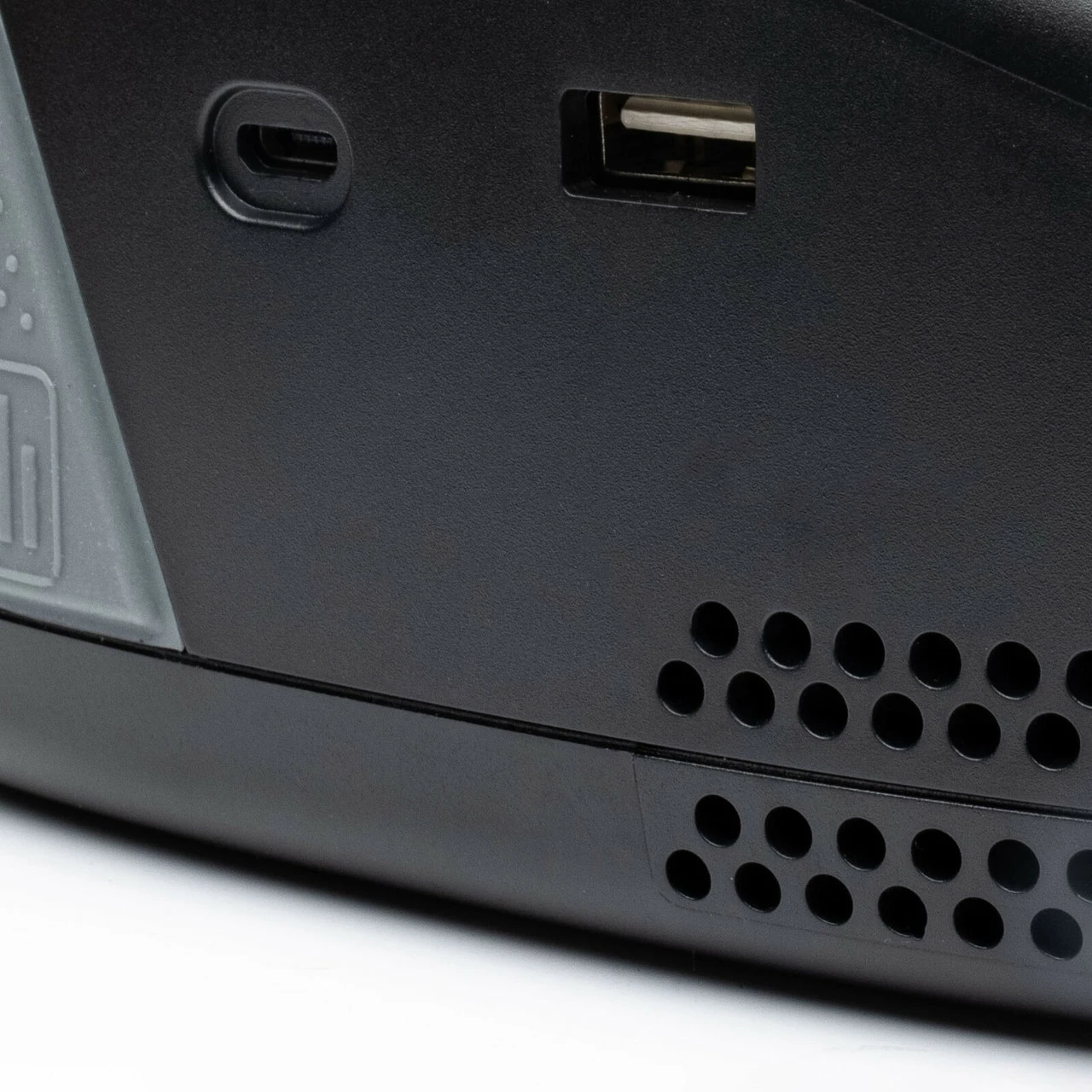 - USB input and output ports are included for updating firmware and charging secondary devices