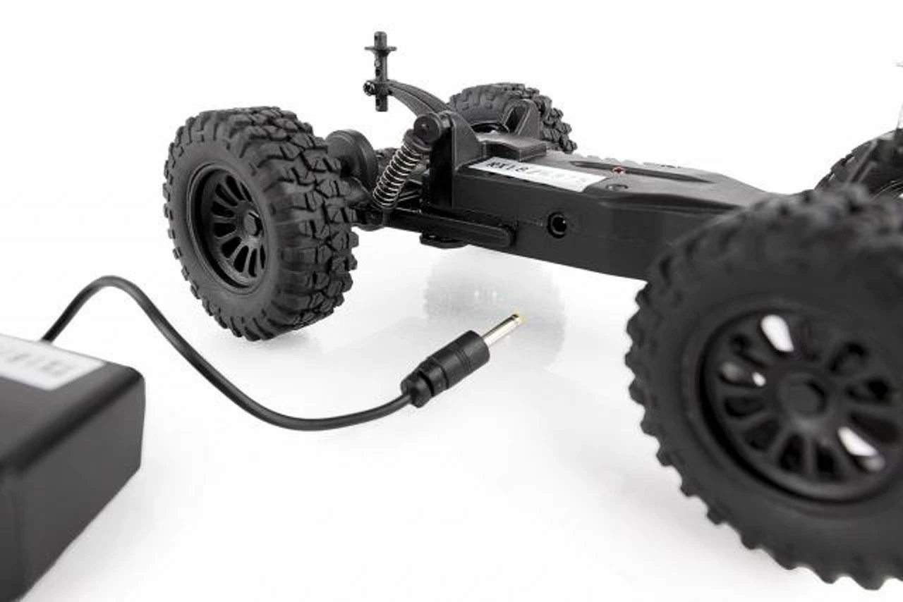 When your offroad thrills exhaust the vehicle’s integrated battery, the convenient built-in transmitter charger makes it easy to get back to full power in less than an hour. A built-in rechargeable battery and 4 AAs are already included in the box! Just charge and drive!