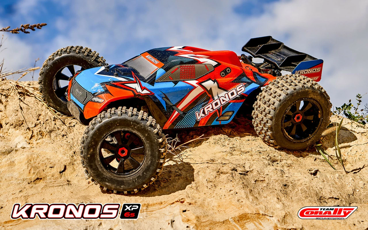 The durable, all-metal four-wheel drivetrain, fully independent suspension, racing chassis, stump-pulling power, and aerodynamic racing bodyshell design, the Kronos XP may be the ultimate electric 1/8 scale monster truggy for drivers looking for an unmatched bashing performance. The Kronos XP RTR is an exciting, impressive all-terrain machine! If you’re looking to make an all-out assault on lesser cars with speed and jumping capability that other cars simply cannot duplicate, then look no further than the Kronos XP RTR from Team Corally!