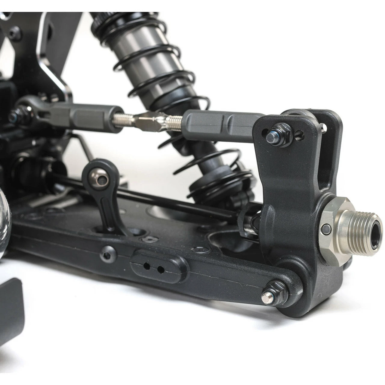 Long front and rear arms provide great bump handling and stability. The arms are stronger using a truss-style base as well as upper stiffener plates to adjust flex for full tuning abilities. Bushings are used for the inner hinge pin area to provide a worry-free, smooth function at all times.
