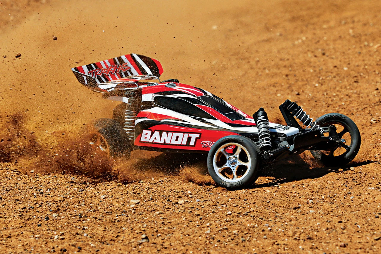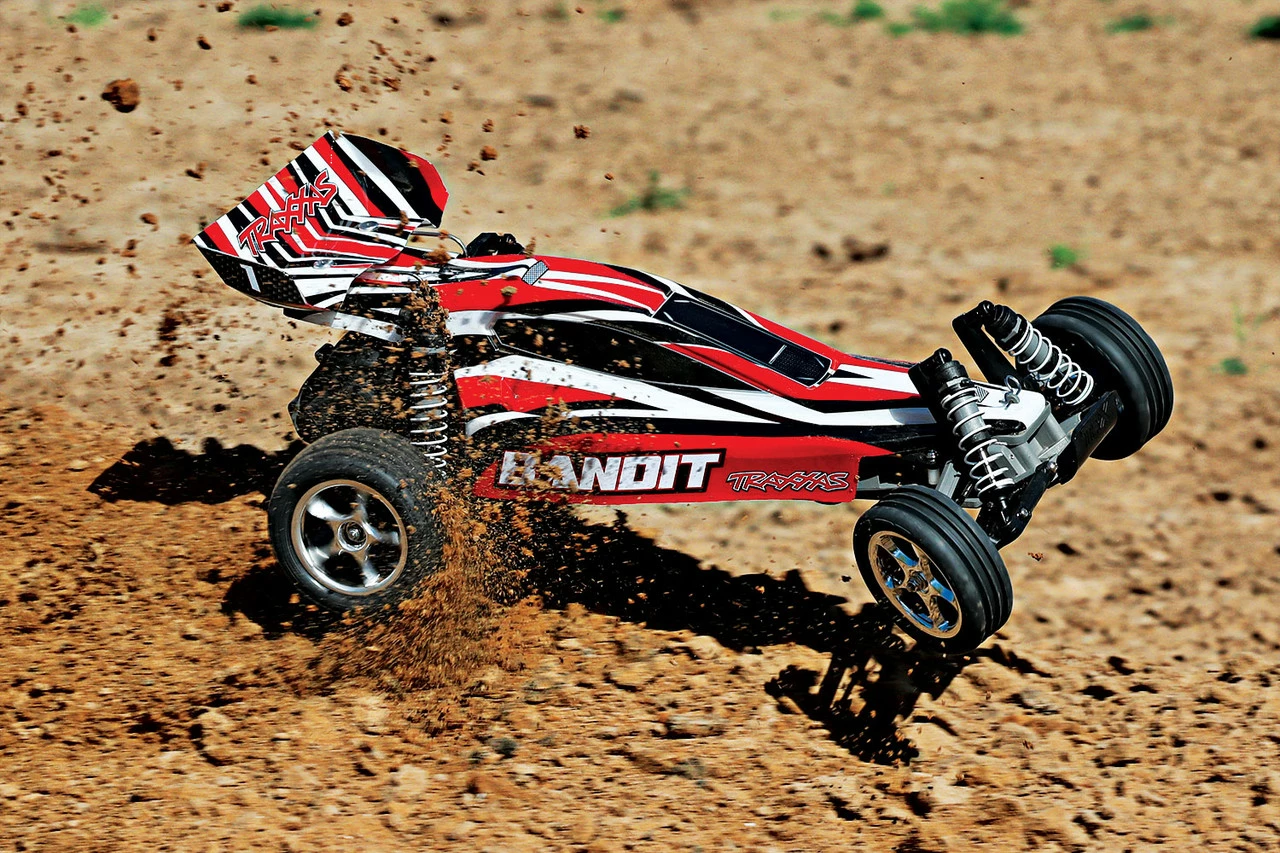 The Traxxas Bandit takes RC fun to a whole new level with faster speeds, innovative technology, and hobby-grade durability with a price that starts under $200! The sleek, lightweight chassis keeps weight down low for razor-sharp handling and blazing 35+mph speed. The powerful Titan® 12-turn motor and waterproof XL-5® Electronic Speed Control power the Bandit through water, mud, and snow for wild all-weather adventures. The advanced TQ™ 2.4GHz radio system provides long-range, glitch-free performance while ripping rooster tails in the mud or soaring over jumps. The included high-capacity 8.4V NiMH Power Cell™ battery provides long run times and charges quickly on the included 4-amp DC Peak Detecting Fast Charger. Step up to genuine Traxxas quality and performance and discover a whole new level of fun with the Traxxas Bandit!