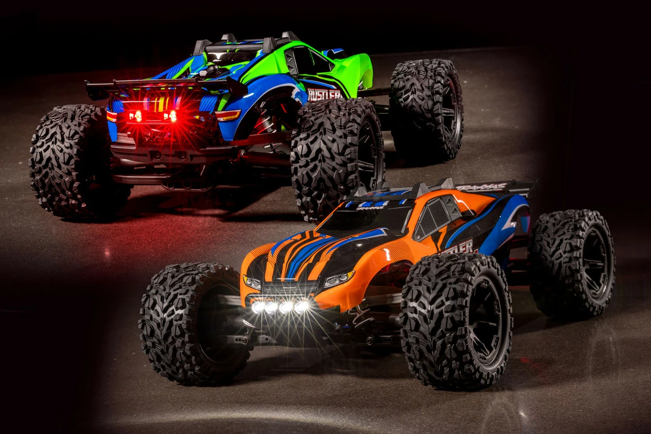 The Rustler 4X4 now includes LED lighting as standard equipment for more fun after dark. Thick impact-resistant bumpers protect the lights against crash damage with fully-waterproof construction for all-weather fun.