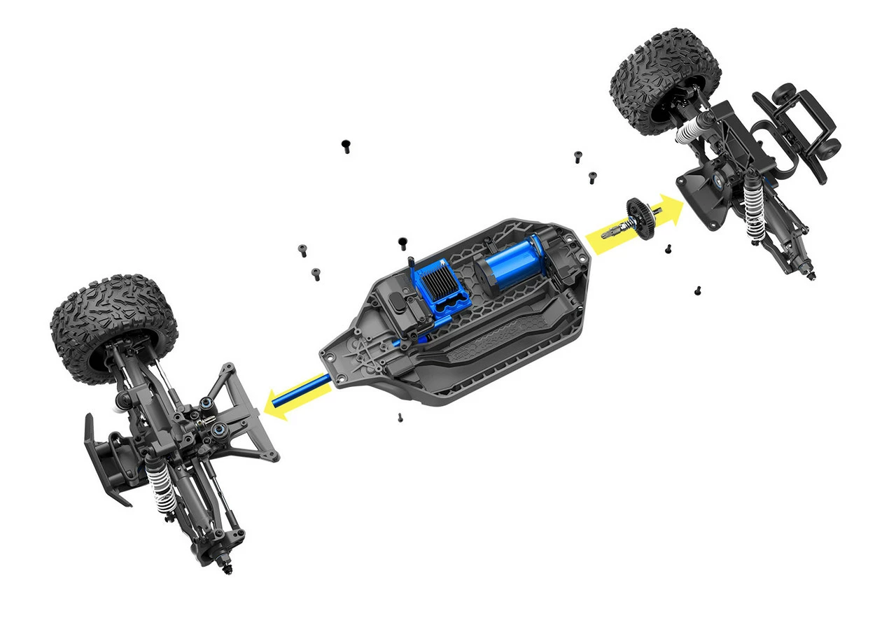 All-New Chassis: The all-new low-CG chassis positions the weight low for aggressive handling. The wheelbase has been lengthened 20mm for the perfect balance of stability and quick response. Brushless Velineon power flows through a larger Revo®-Specslipper clutch and new extreme heavy-duty driveshafts to ensure performance and strength.