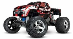 The Traxxas Stampede is the original high performance monster truck. Its legendary ruggedness has made the Stampede name synonymous with off-road fun. Today, the Stampede has a bold look, innovative features, and of course, more power. With a top speed of 30+mph and a tall drive-over-anything ground clearance, Stampede rips through grass and powers over curbs. Waterproof electronics allow it to blast through puddles and shred snow for all-weather adventure. Step up to genuine Traxxas quality and performance and discover a whole new level of fun with the Traxxas Stampede!Â