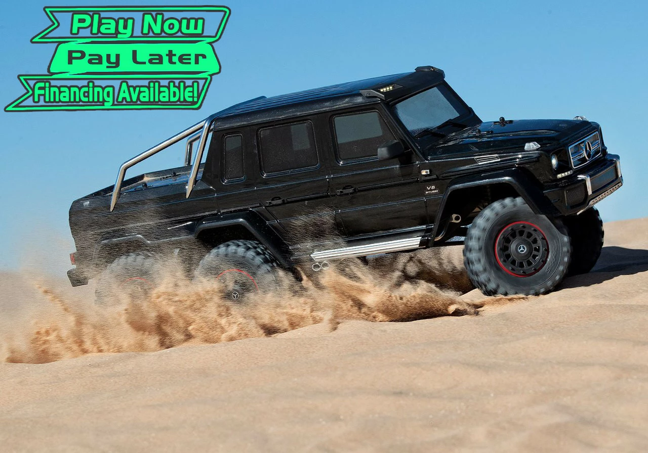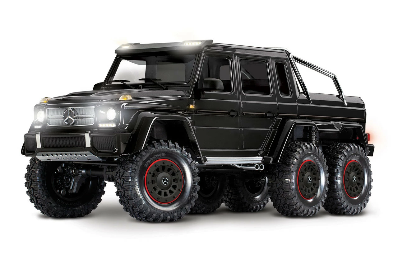 The Mercedes-Benz G 63 AMG 6×6 represents a singular vision to create the boldest and toughest all-terrain vehicle ever. Traxxas captures the spirit and no-compromise approach of the Mercedes-Benz G 63 AMG 6×6 with an officially licensed detailed scale replica built on the proven TRX-4® platform. Six drive wheels, three T-Lock™ remote-locking differentials, portal axles, high/low transmission, 6 aluminum long-travel shocks, and a stunningly accurate body with brilliant LED lighting make this the most advanced and capable RC crawler ever to hit the trail.