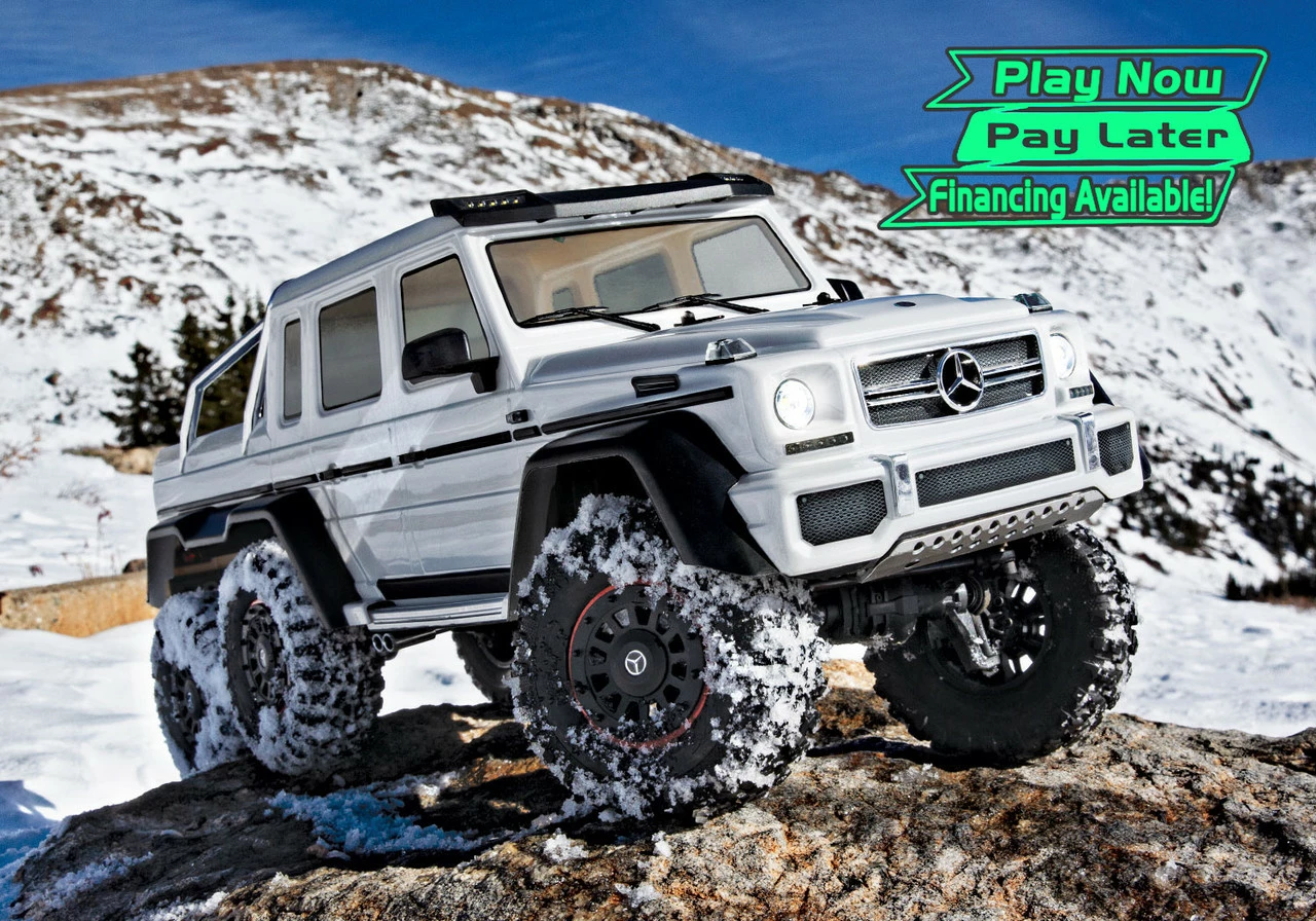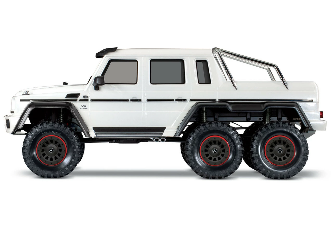 The Mercedes-Benz G 63 AMG 6×6 represents a singular vision to create the boldest and toughest all-terrain vehicle ever. Traxxas captures the spirit and no-compromise approach of the Mercedes-Benz G 63 AMG 6×6 with an officially licensed detailed scale replica built on the proven TRX-4® platform. Six drive wheels, three T-Lock™ remote-locking differentials, portal axles, high/low transmission, 6 aluminum long-travel shocks, and a stunningly accurate body with brilliant LED lighting make this the most advanced and capable RC crawler ever to hit the trail.