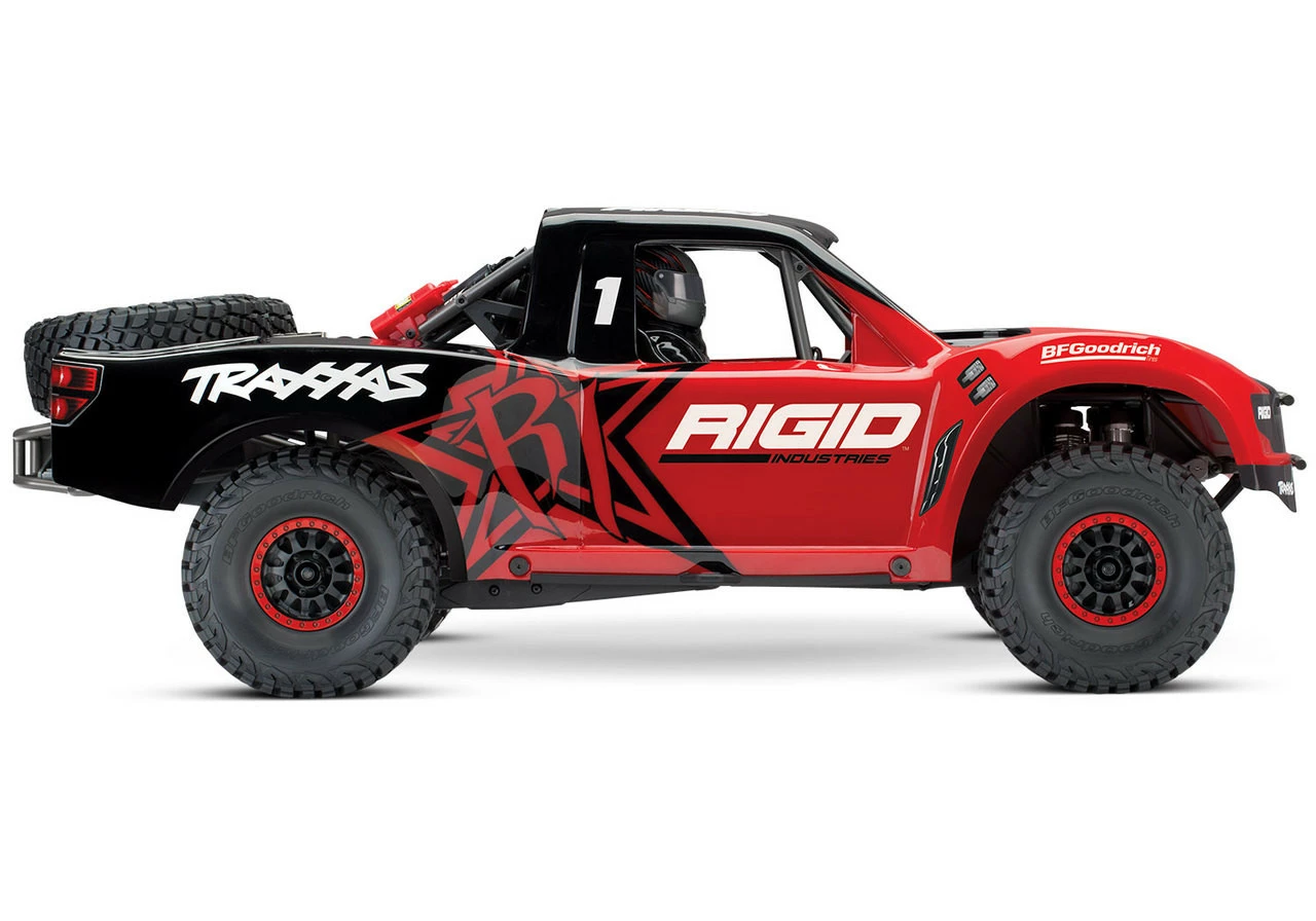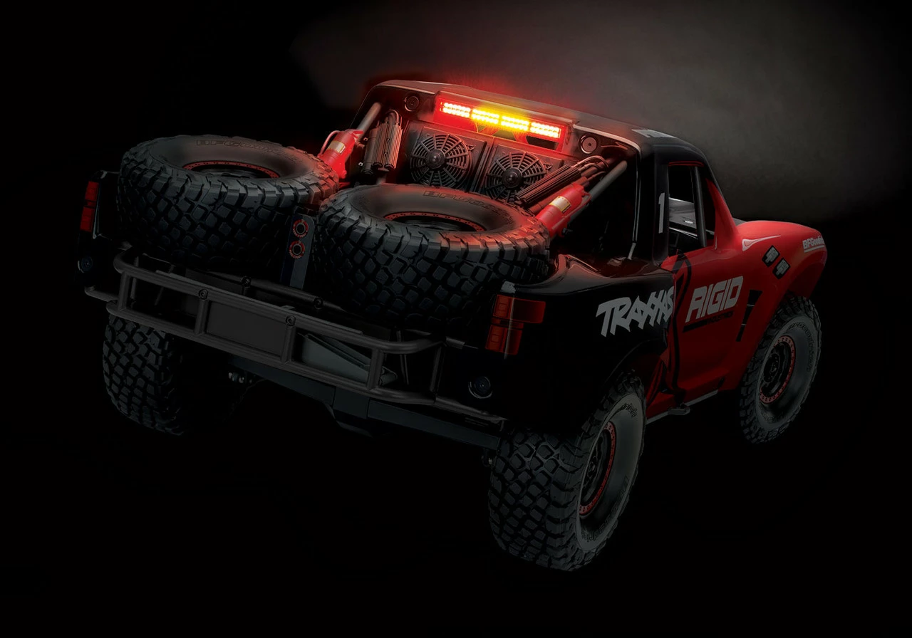 The Traxxas Unlimited Desert Racer Race Truck is engineered on an authentic, true to scale 4-wheel drive desert race truck chassis. The 4-link solid rear axle design provides huge suspension travel with authentic driving dynamics. From the cantilever sway bars to the 8 GTR shocks, Traxxas has accurately reproduced a true unlimited desert race chassis in both form and function.